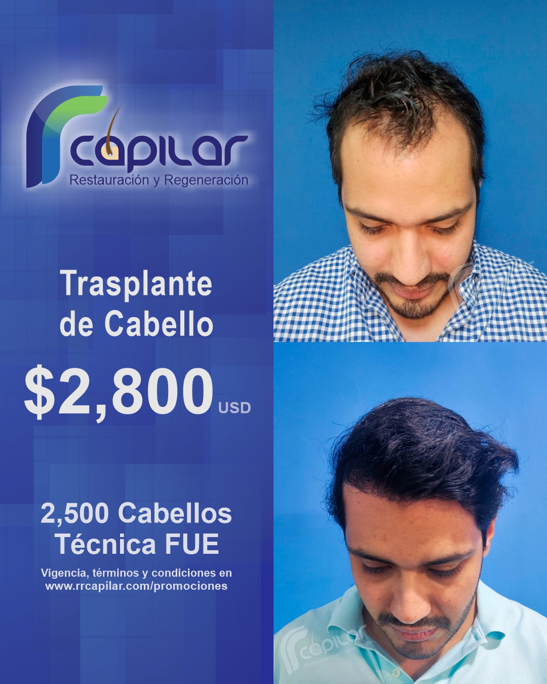 RRCapilar te ofrece este paquete (Vigencia 30-Abr-2024) en trasplante de pelo de 2,500 Cabellos por $2,800 USD en pago de contado y en efectivo. Técnica FUE, ambulatoria, sin cicatriz. Incluye: Honorarios del Staff Médico, Clínica y Revisiones. Más de 15 años de experiencia nos respaldan. El Injerto puede ser en Cabello, Ceja, Bigote o Barba. No Incluye: Impuestos, costo de consulta inicial, medicamentos, estudios de laboratorio, productos recetados u otros no mencionados en el apartado “Incluye”.